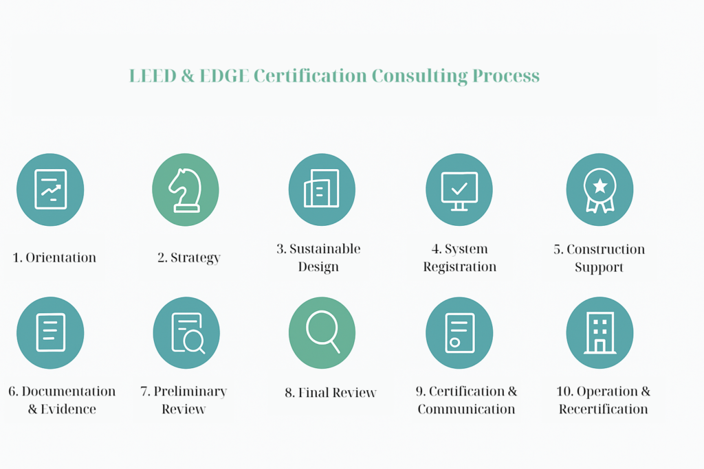 The LEED & EDGE certification consulting process supports investors through design, construction, and operation to achieve sustainable and internationally recognized green buildings.